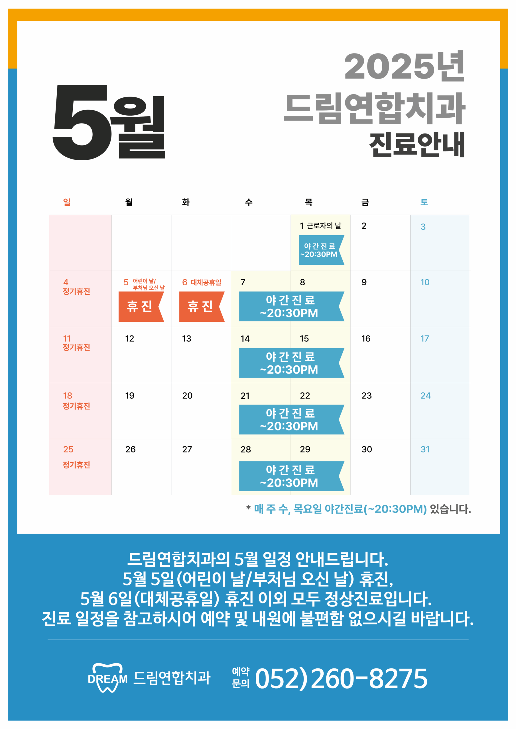 울산치과,드림연합치과 5월 진료일정 안내💐|가정의 달 치과 방문 전 확인하세요!