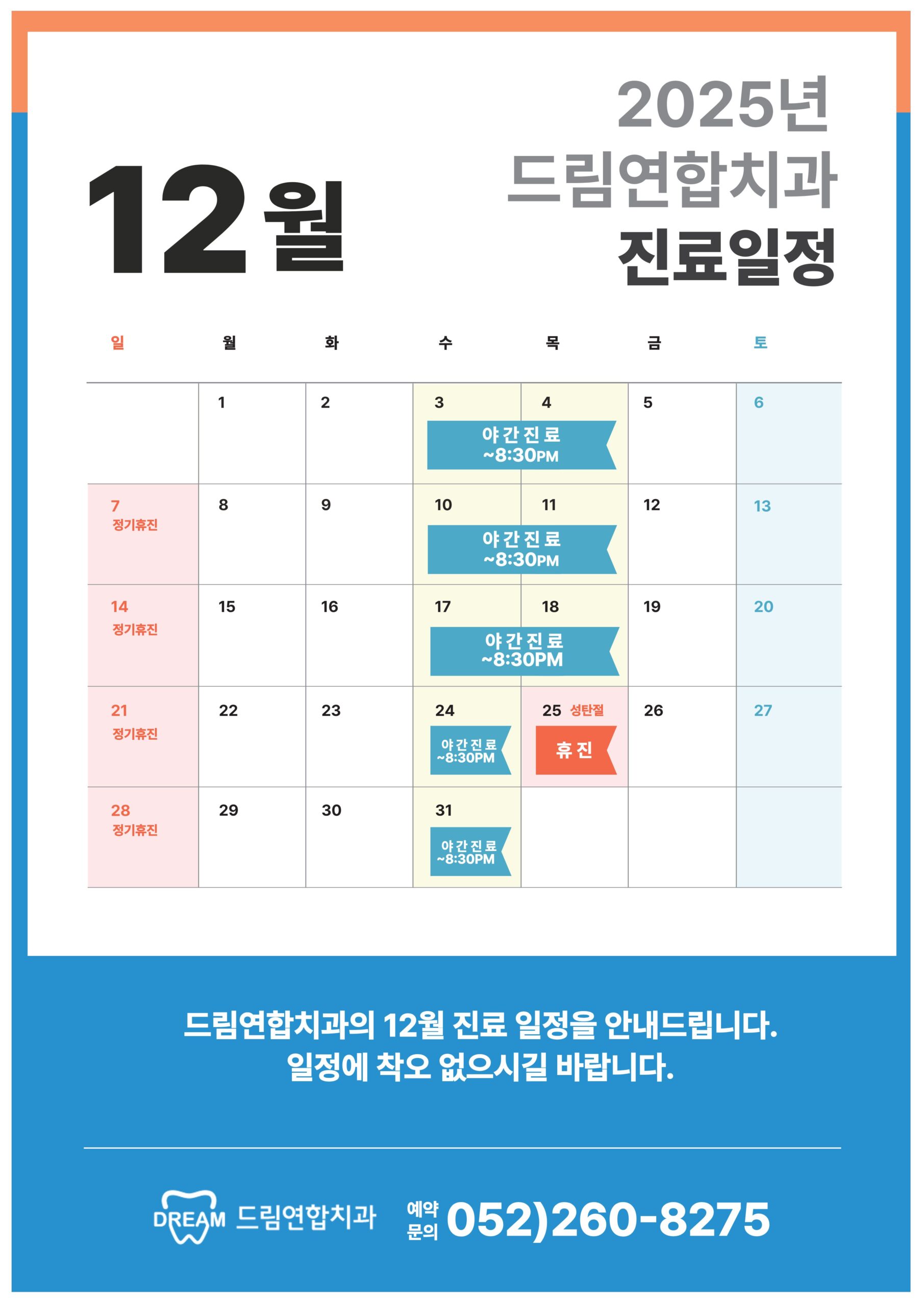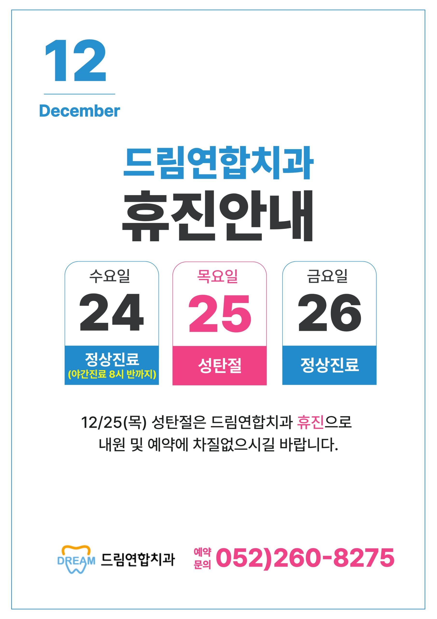 2025년 12월 진료 일정 및 성탄절 휴진 일정을 아래와 같이 안내드립니다.